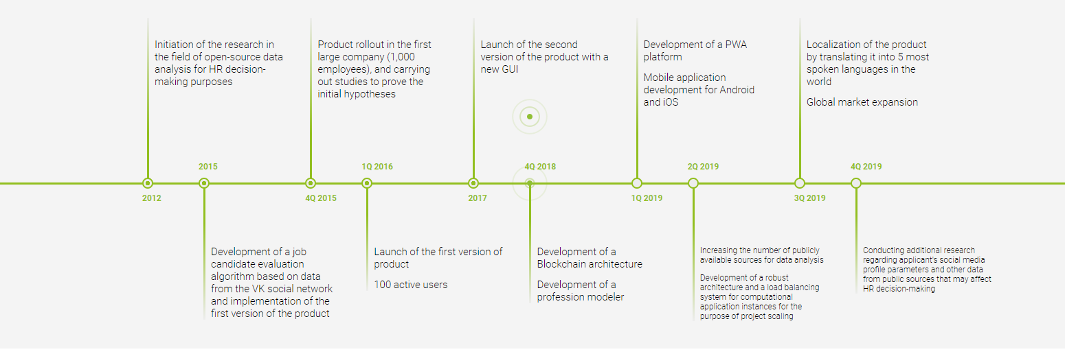 is an artificial intelligence (AI) system for helping small enterprise executives and employees of personnel services to make HR decisions. The system analyzes data from social media and publicly available sources and uses a blockchain-based architecture for data storage.