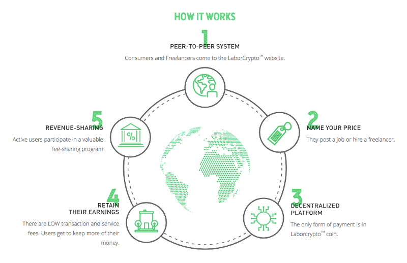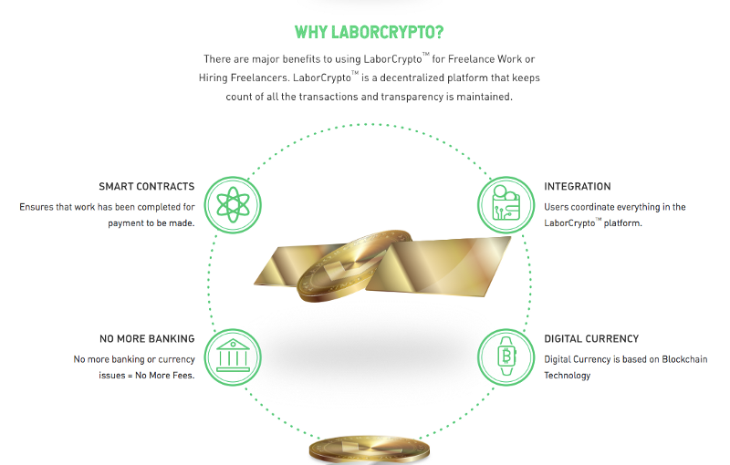 Digital banking– the goal to re-invent the freelancing community will also involve a virtual currency (LaborCrypto token) and the elimination of banking services for the transactions.