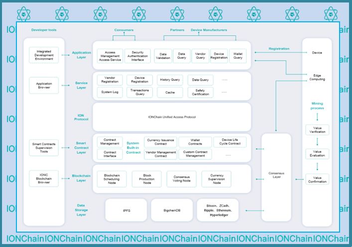 Value generation encompasses IONChain Connected IoT devices and Edge Computing centers near the device. All devices will have a standardized IONChain protocol and a unique IONChain identification code, in which the device manufacturer information, device identification, and other related information are included. The information is stored in the device and encrypted with zero knowledge proof algorithm. The IoT devices can be used as a mining machine, and the information from it can produce IONC coins after certain algorithm verification. All the IoT devices embedded in IONChain communicate via a customized IMQTT protocol by IONChain. The MQTT protocol was initially developed by IBM for communication between IoT devices; However, it does not include the value transfer layer. IONChain adds the function of value transfer on top of MQTT protocol, creating the IMQTT protocol. With the use of IMQTT protocol, IoT devices can not only exchange data but also realize value transference".