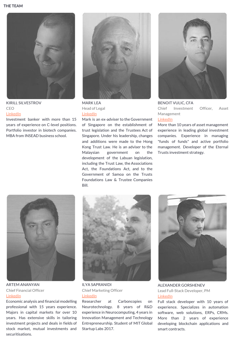 The CEO of Eternal Trusts is a man named Kirill Silvestrov, who has a background in investment banking. The company’s other employees listed on the Eternal Trusts website have backgrounds in areas such as asset management, trust establishment, blockchain development, and biomedicine. Silvestrov and most of the employees at Eternal Trusts appear to be natives of Russia.