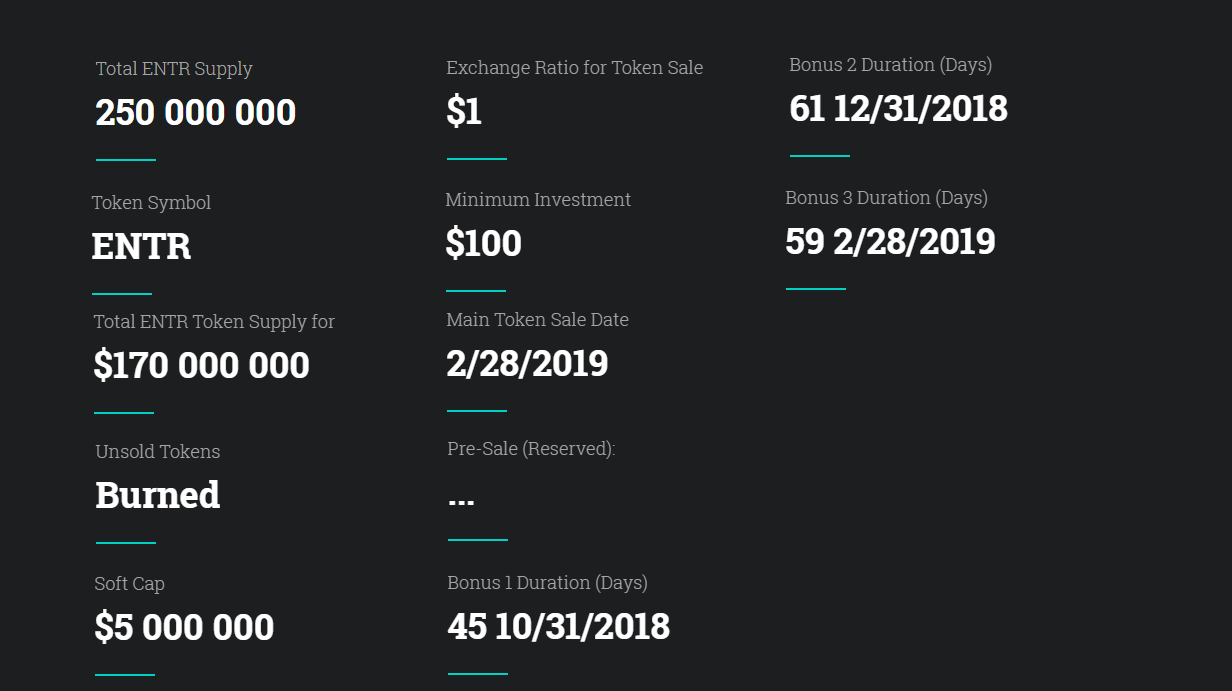 The tokens will be pre-sold at 1 ENTR = 1USD. All unsold tokens would be burned.