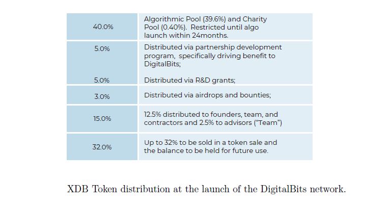 XBD serves as the principal currency of the DigitalBits platform with a maximum supply of 100 billion tokens and since the DigitalBits blockchain happens to be a fork of the stellar lumen blockchain, XBD can boast of remarkable payment and remittance performance. Also, Staking 10 XBD token is required to authenticate and grant users access to the DigitalBits blockchain and lastly XBD serves as a bridge between other pairs of digital assets on the DigitalBits blockchain. 35% of the total supply of XBD is currently available for purchase in an initial coin offering scheduled to end on the 31st of March 2019.