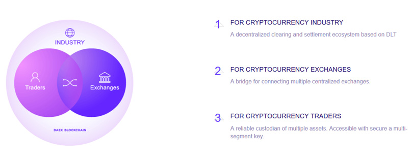 The cryptocurrency industry will be able to benefit from DAEX’s status as a decentralized settlement and clearing ecosystem that is based on distributed ledger technology. Cryptocurrency exchanges will be able to use the DAEX ecosystem as a bridge to connect several centralized exchanges. Finally, traders of cryptocurrency will get a reliable custodian for their range of assets, complete with access via a secure multi-segment key.