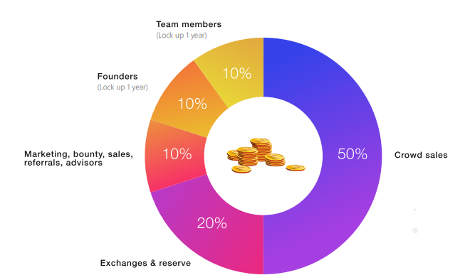 The total number of Crypto Market Ads (CMA) tokens will be 10 Billion. The pre-ICO phase will last for 1 month, and the ICO itself for 2 months. The hard cap has been set at 5 Billion tokens. All unsold tokens will be burned. The distribution structure is as given below.
