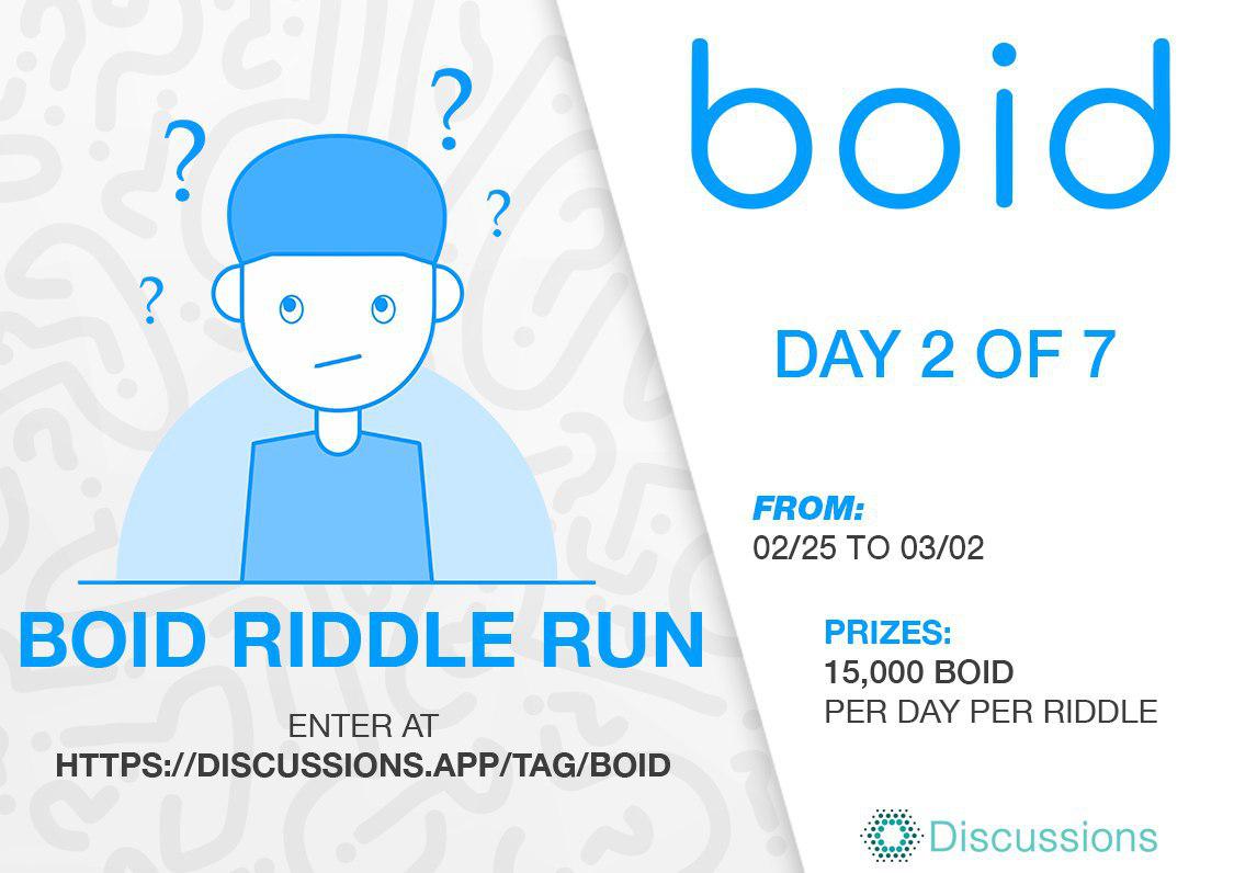 • The second riddle is now live at: https://discussions.app/tag/boid/27xs43912dkdi/boid_riddle_run_day_2_riddle Be the first to submit the correct answer and win 10K BOID! 🏆