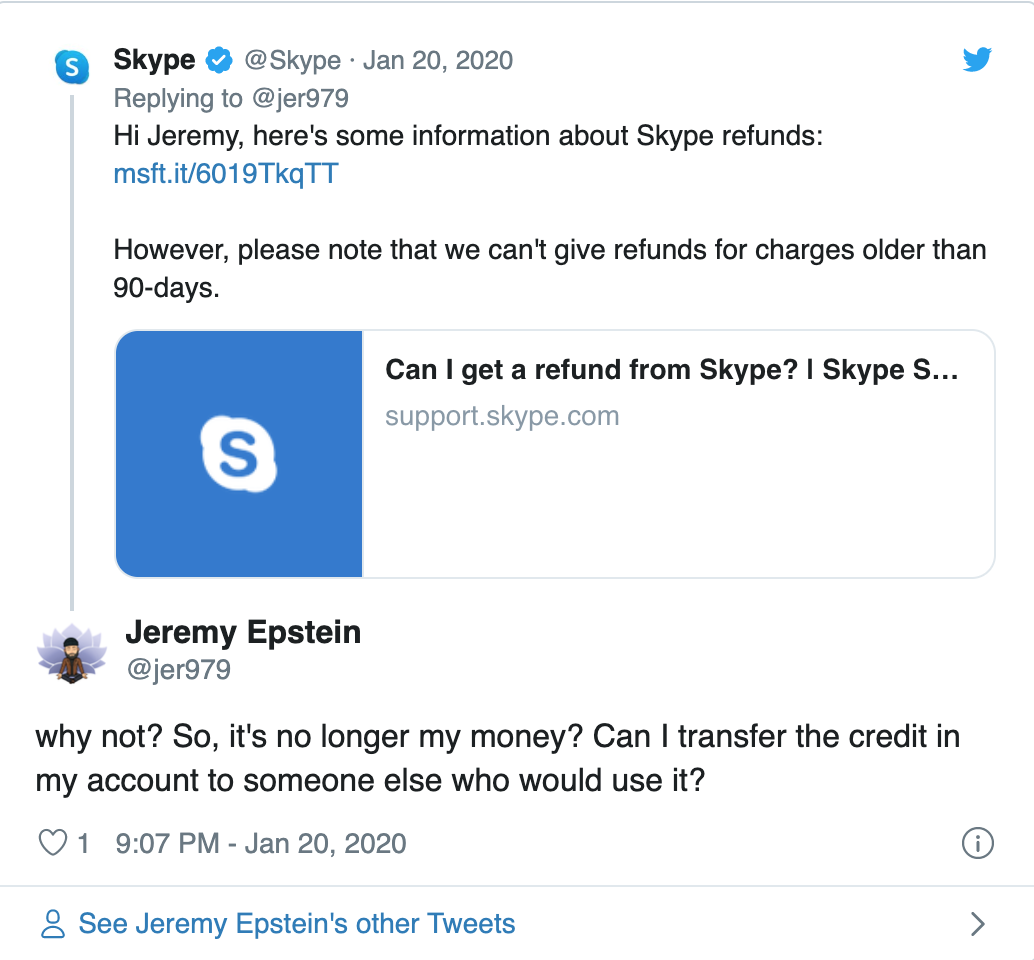I should be able to trade my Skype credit to someone who does use Skype on a regular basis. Maybe I trade it as a discount and maybe I trade it at full market value. That depends, of course, but at the end of the trade, everyone-including Skype-is better off.