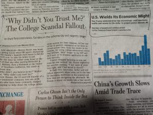 Finally, the front page had two articles side by side with the idea of institutions behind them. The first was about how kids in college entrance fixing scandal felt betrayed by their parents. Again, not my primary concern because it’s the layer on top of the issue of “can we trust the institution of college to select the most qualified students and thereby trust the diplomas they get as a measure of intellectual quality, refined character, and work ethic?