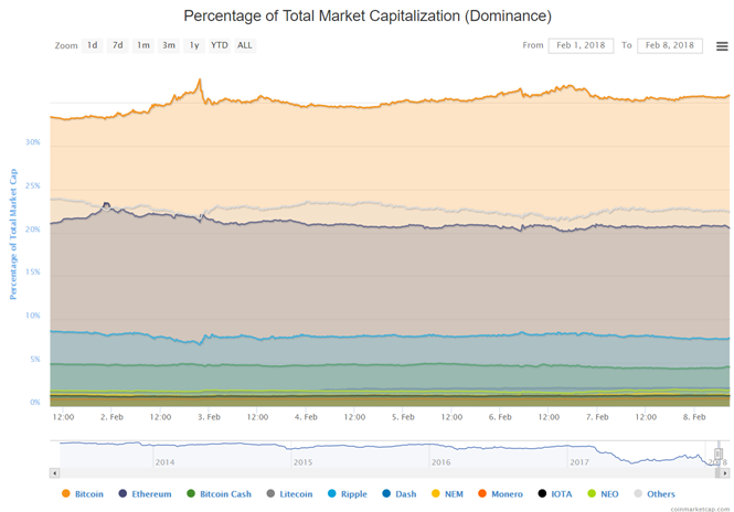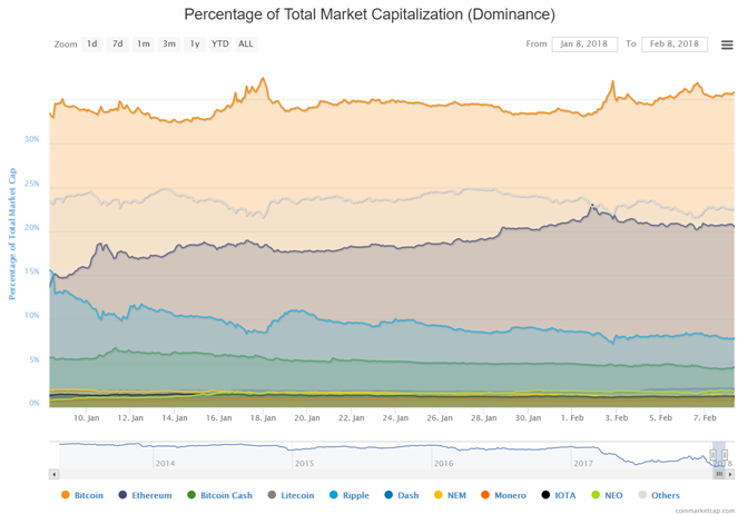 * 위 시총액 자료에 이어 시장점유율을 보자면, 월간으로는 이더리움의 비율이 증가하였으며 비트코인의 점유율은 큰변동이 없습니다. 17년부터 비트코인의 시장점유율은 상당히 많이 하락하였습니다. 이것은 필시 고전기술(비트코인)을 통해 진화하고 있는 기술발전(스마트컨트랙트 등)에 대한 관심과 자금 이동에 기반 하였다고 생각합니다. 세대교체는 빠르게 오지는 않겠지만 언젠가는 이루어 질 사안입니다. 점유율의 변화는 가치변화의 지표뿐 아니라 그것을 미리 예상할 수 있는 징표가 아닌가 싶습니다.