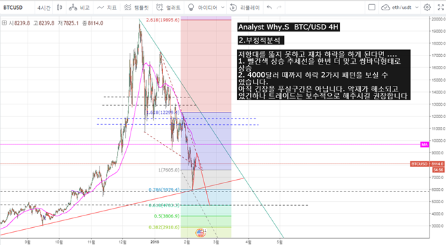 * 2. BTC 부정적인 분석 : 저항대를 뚫지 못하고 재차 하락을 하게 된다면, (1) 빨간색 상승 추세선을 한번 더 터치하고 쌍바닥 형태로 상승 가능 또는 (2) 4000달러 부근까지 하락 가능 으로 2가지 패턴으로 생각해 볼 수 있습니다. 아직 긴장을 풀 구간은 아니며, 악재가 해소되고 있기는 하나 트레이드적인 면은 보수적으로 접근하시길 권해드립니다.