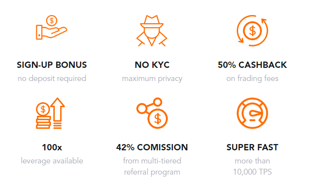 Бонус за регистрацию для всех новых пользователей, отсутствие обязательной верификации и высокий уровень конфиденциальности пользователей, возможность торговать с кредитным плечом до 100Х, возможность получать до 50% процентов кешбека на торговую комиссию.
