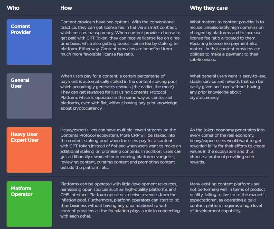 Contents Protocol seeks to reward the users for contributing to the content platform through the use of their data. The protocol is committed to transfer this habit to a real life business and further fast-track the public adoption of blockchain technology.