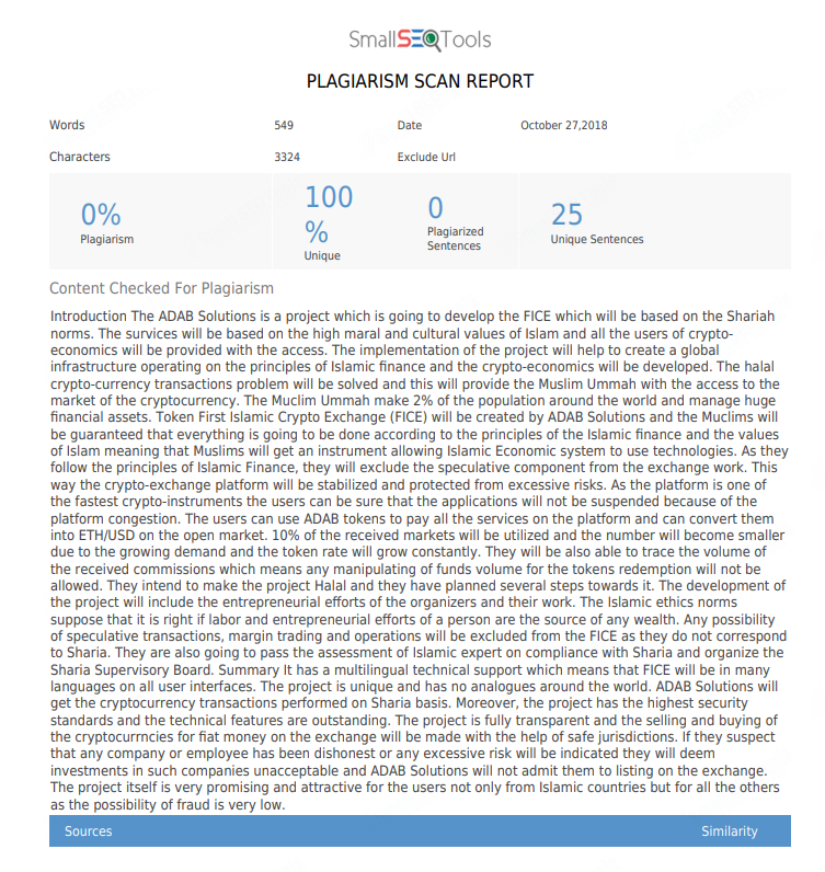 It has a multilingual technical support which means that FICE will be in many languages on all user interfaces. The project is unique and has no analogues around the world. ADAB Solutions will get the cryptocurrency transactions performed on Sharia basis.