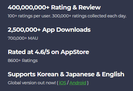Over the last 6 years, WATCHA Inc. has attracted 4.5 Million users with 400M reviews while providing WATCHA, WATCHA PLAY, WATCHA MUSIC, and WATCHA WEBTOON services in South Korea and Japan.