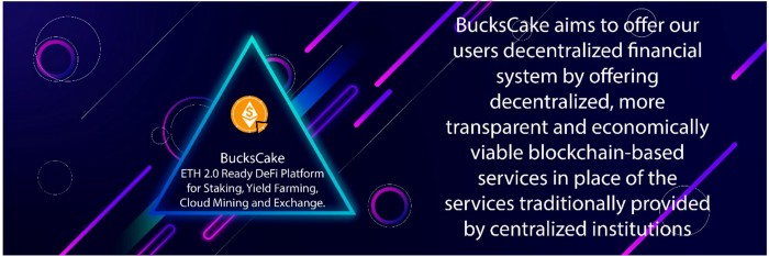 BKC is a DeFi protocol that aims to provide maximal recoil of the Ethereum ecosystem for everyone with access to the internet. BKC is unique by it's providing a completely secure and transparent experience proved by smart contracts and a powerful token system. BKC offers a lot of services, ranging from staking and yield farming, that users can get access on the unified BucksCake platform.