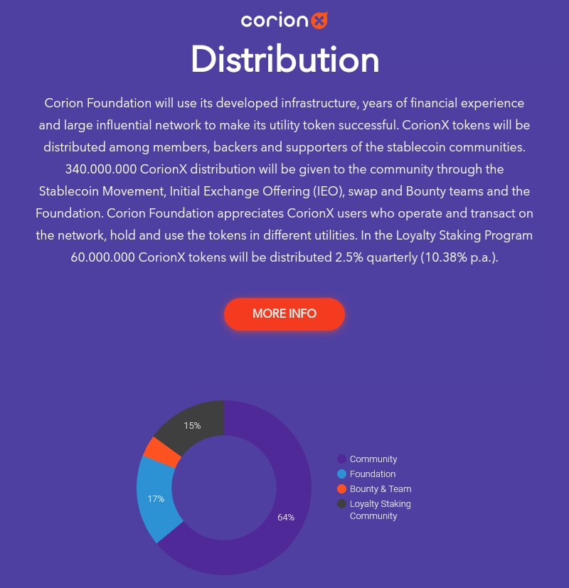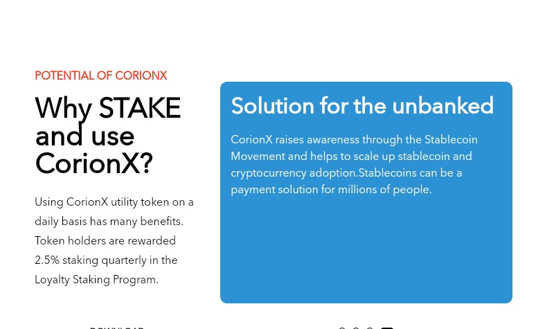 CorionX is an ERC 20 compatible, ethereum based utility token and it is for the use of stablecoins, CBDCs and DeFi. It creates the structure for education and promotion of stablecoins payment option throughout the globe.