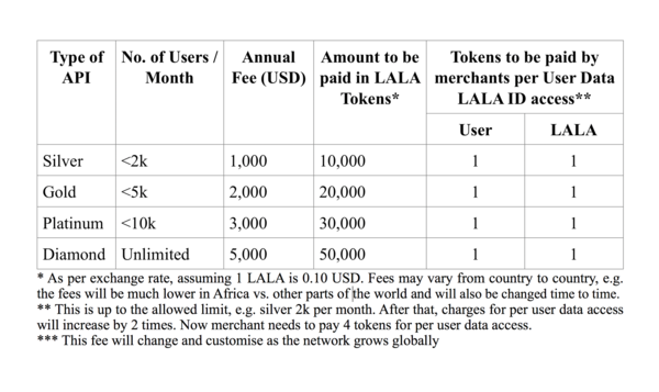 Service providers / LALA Partners across the globe pay for LALA ID API in annual as well as transactional fee as detailed below, in LALA Tokens. Merchants have to purchase these tokens from the market, other partners and specified locations, which should further increase the demand of tokens.