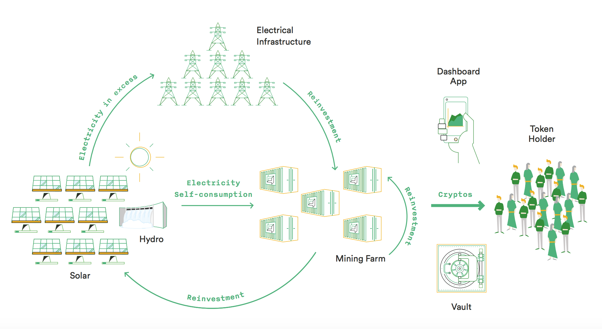 Thanks to the high level of organizing the work of the mining farm, aimed at reducing costs and increasing a user's profit, each investor gets access to cost-effective projects. Renewable energy allows not only to reduce costs, but also has a positive impact on the environment.