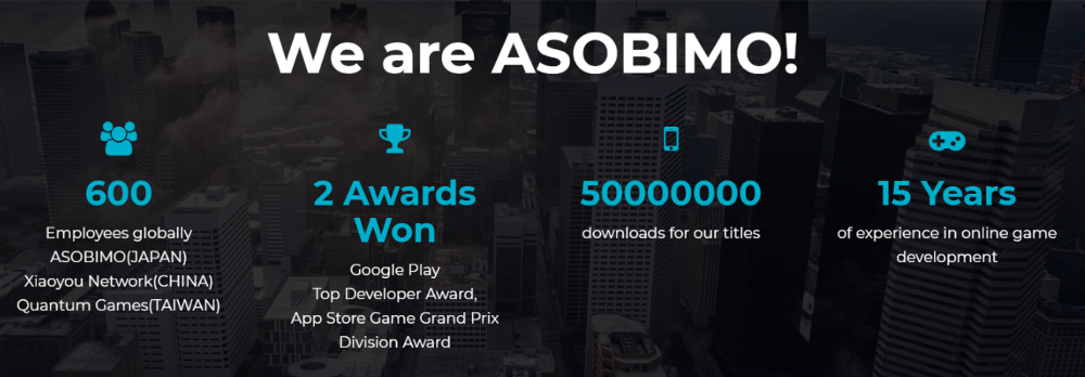 ASOBI is a Japanese company, I applaud you Asobimo on the numerous awards over the years 600 employees globally, 2awards won from Google Play Top Developer Award,App Store Game Grand Prix Division Award ,With 15years of a experience your no longer to be called a baby, I crown Asobimo a boss of all other mobile online games. I recently visited asobimo YouTube to watch one the mobile online games! After, that my heart was lifted.