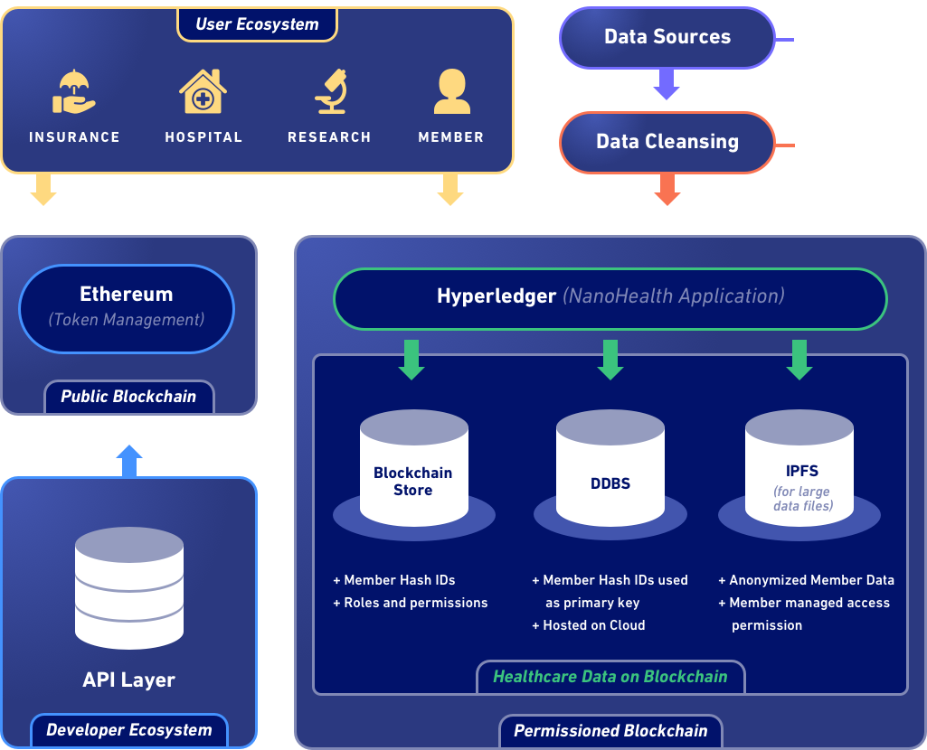 1:Hyperledger manages all healthcare data users and roles, proprietary algorithms for healthcare management and prediction.