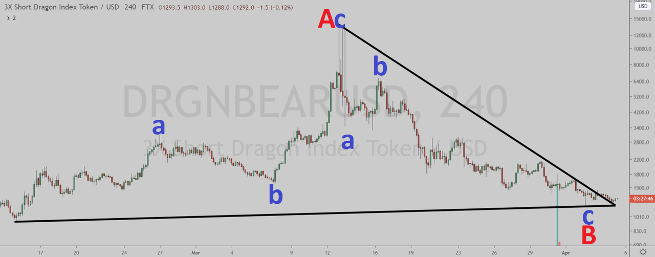 In Elliott Wave terms, DRGNBEAR began a red wave A (blue sub-waves a-b-c) advance on February 15. The red wave A finished on March 13, and the red wave B (blue sub-waves a-b-c) correction ended on April 2. If this wave count is correct, DRGNBEAR should be heading next towards the March 13 peak in the red wave C.