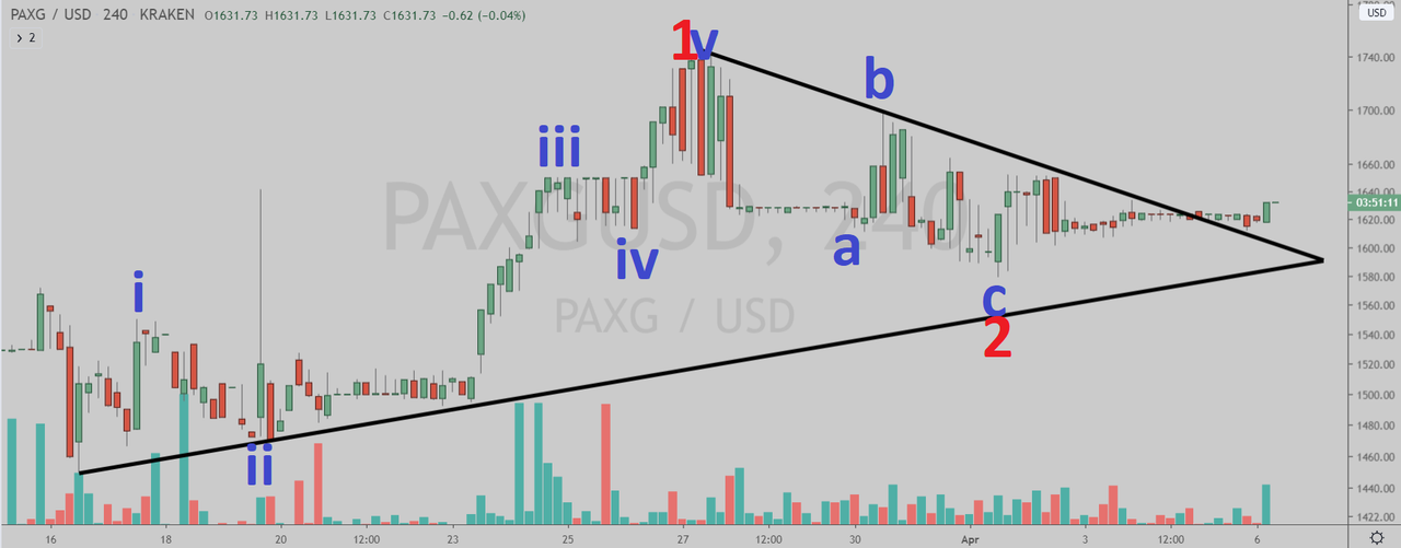 In Elliott Wave terms, PAXG began a wave one advance on March 16. The red wave one (blue sub-waves i-ii-iii-iv-v) finished on March 27, and the red wave two (blue sub-waves a-b-c) correction ended on April 1. If this wave count is correct, PAXG should be heading next towards the March 27 peak in the red wave three.