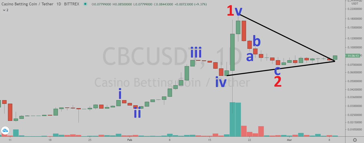 Casino Betting Coin (Bittrex: CBCUSDT) has broken out of the triangle pattern in the daily chart.
