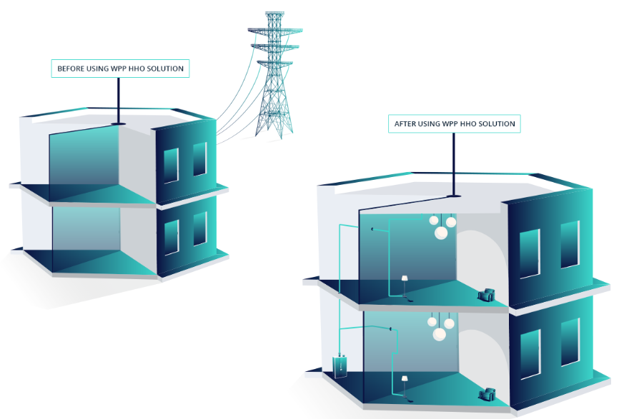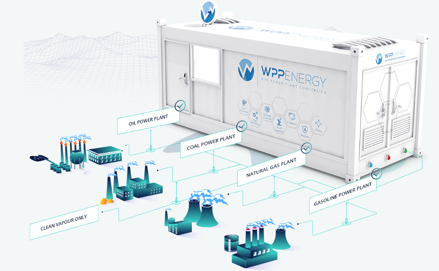 Решение конверсии WPP видит внутри 20-дюймового контейнера, который позволит превращать природный газ, нефть, уголь и бензиновые электростанции в высокоэффективное нулевое загрязнение водородных паровых заводов (HHO).