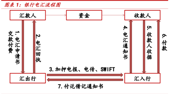 银行电汇以环球同业银行金融电讯协会SWIFT为主导,SWIFT跨境支付系统采用代理银行模式,汇款银行和收款银行必须同为SWIFT成员机构资金才能在该系统中流转。