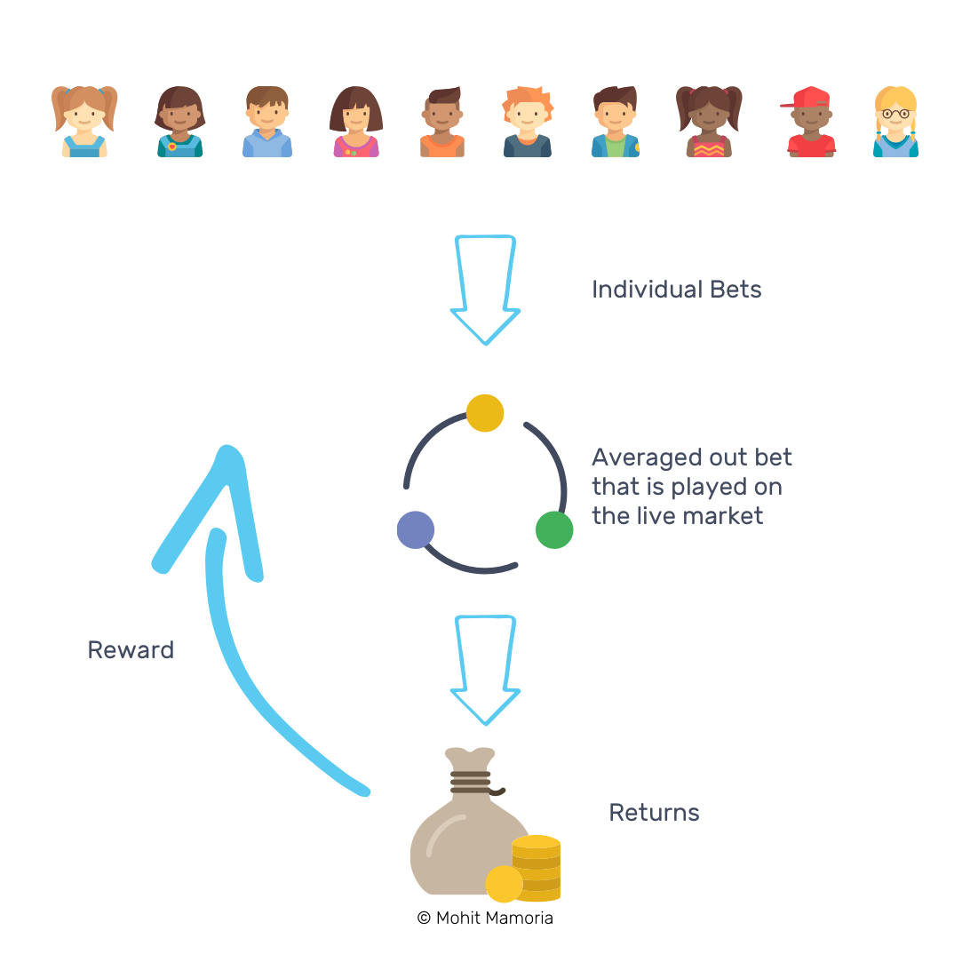 The process starts with hundreds, or even thousands of people casting their bets/votes, based on their own research about the market. Each of those individual bets is then carried out on the live market by the hedge fund for a particular period. Once the period has elapsed, the bets are evaluated on the returns they have made. The participants are then rewarded proportionally to the returns their bets yielded.