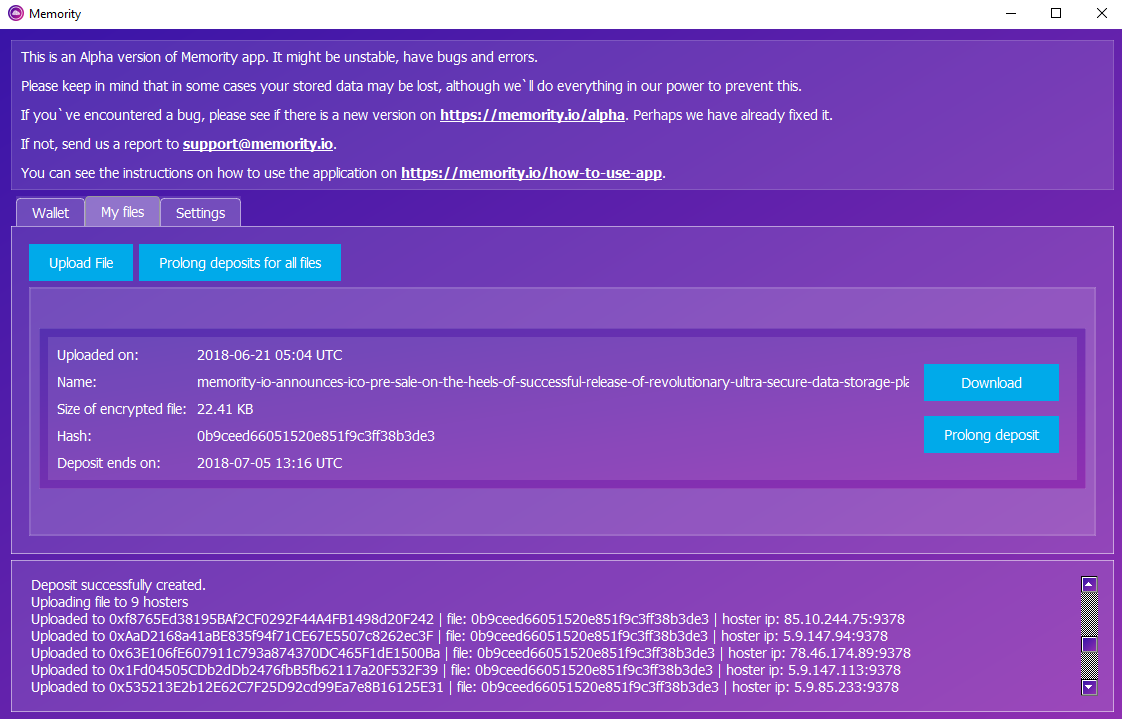 There you go, all done! You've successfully uploaded your first file on Memority. Now, you can either Download or click Prolong deposit to place more fees and extend the storage duration of your file.