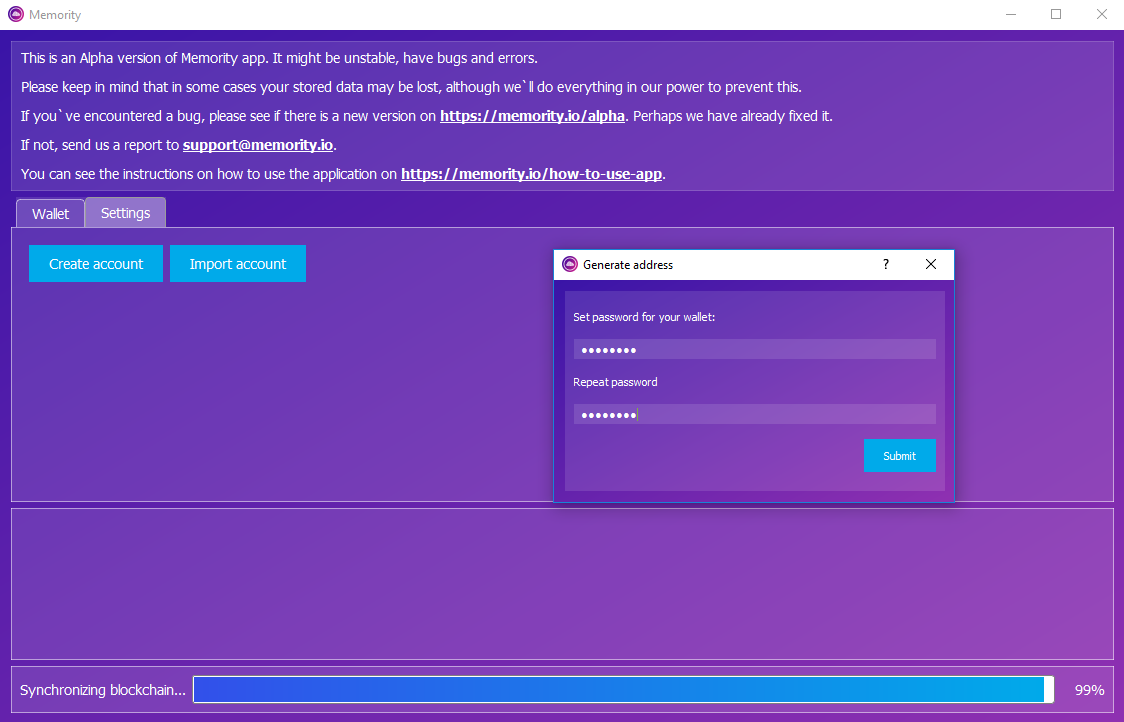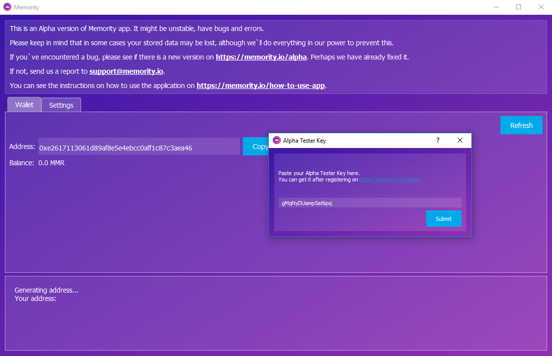 Click Submit to proceed with the new account creation. A unique wallet address will be generated. Next, enter the Alpha Tester key: gMqNyDUamp5at6pq