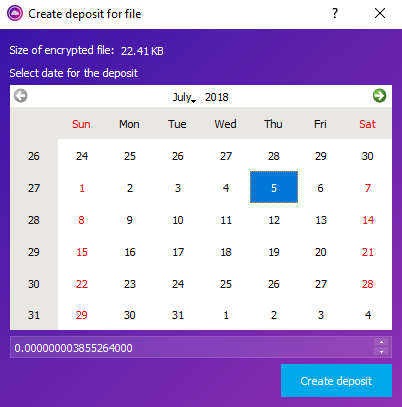 You then have to select date for the deposit and the cost of storage of the selected file for a two-week period. Seems like there's a minimum period of two weeks because you can't select any other dates before that. After the file gets uploaded and distributed to the hosters, it will alert the user as follow: