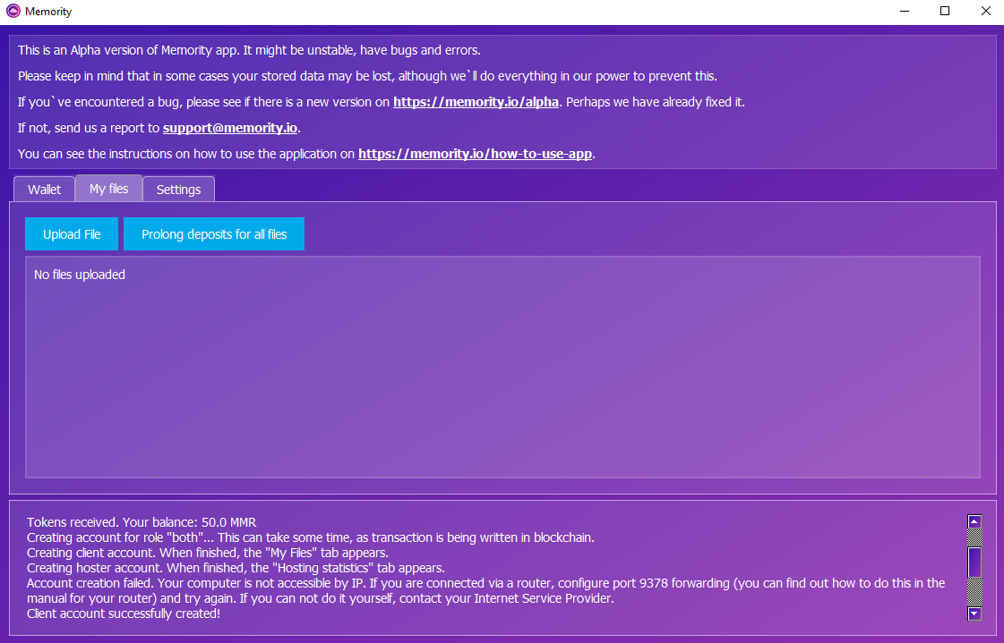 If your client account is successfully created, you should be seeing a new navigation tab called My Files. Go to that and click Upload File to select the file you want to deposit through the app. Memority will search for available hosters. Once found, they will send the file metadata to the contract and the following will be displayed: