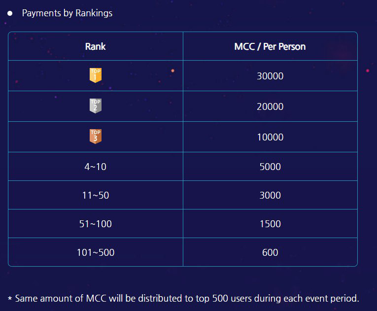 To celebrate MCC being listed on Bithumb DEX, during the event period, MCC Airdrop event will be carried out to reward 1000 users who trade MCC.
