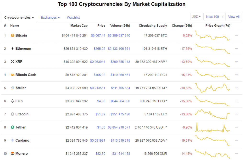 The last period is not favorable for investors in cryptocurrencies. Virtually all cryptocurrencies (including the US dollar-based Teters) are declining, at 5-20%. Ethereum suffered the most, with a price drop of 60 $ in just two days. Listed below are the top 10 cryptocurrencies in terms of market capitalization and as you can see, the situation does not look promising.