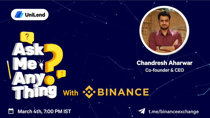 On February 23, Binance announced that it would list $UFT on its platform. As usual in its token listing process, Binance invited UniLend to participate in an AMA on its TG channel(https://t.me/binanceexchange) March 4. Chandresh Aharwar, CEO of UniLend was present at this AMA and answered several questions. Below is a recap of this event.