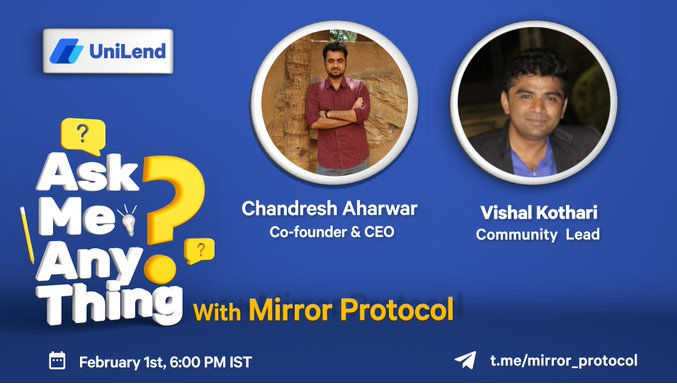 After the announcement of the partnership between UniLend Finance and Mirror Protocol, a new AMA was held, this time on the Mirror TG channel (https://t.me/mirror_protocol), where Chardresh Aharwar, UniLend's founder and CEO, Vishal Kothari, UniLend's community lead and Ayush Garg, UniLend's marketing ops lead, answered several questions, including the some details abut this parnership. Here is the recap of this event.