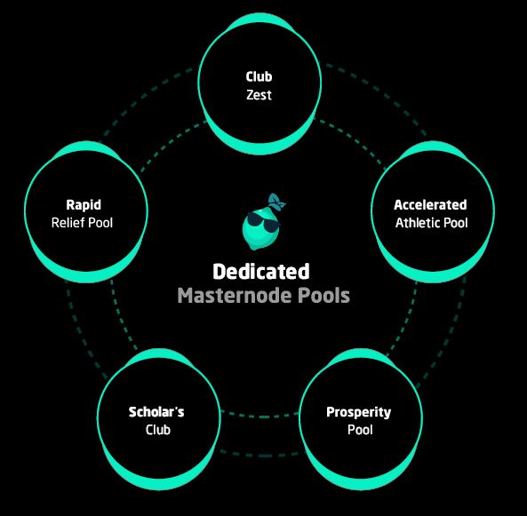 During Zest’s pre-mine, the Team will allocate 30 Masternodes, or 75,000 ZestCoins, to Their Dedicated Masternode Pools (six Masternodes for the Rapid Relief Pool, six Masternodes for the Scholars Pool, six Masternodes for the Accelerated Athletics Pool, six Masternodes for the Prosperity Pool, and six Masternodes for Club Zest), and the Masternode Owners are able to vote the right destination of the Charity Funds.