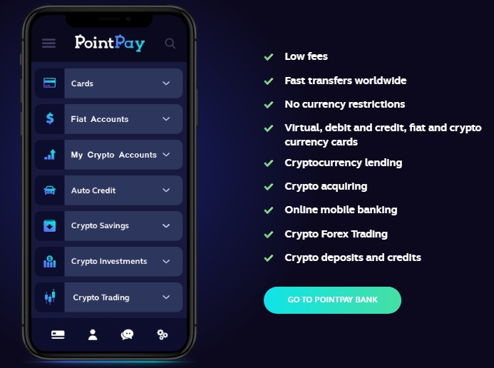PointPay crypto bank; you will be able to trade with crypto bank without low fees, fast transfer worldwide in crypto asset transactions, currency restriction. PointPay crypto banking also includes virtual, bank and loan, fiat and cryptocurrency cards, Online mobile banking, crypto consulting, cryptocurrency investment, cryptocurrency trading, cryptocurrency lending services.