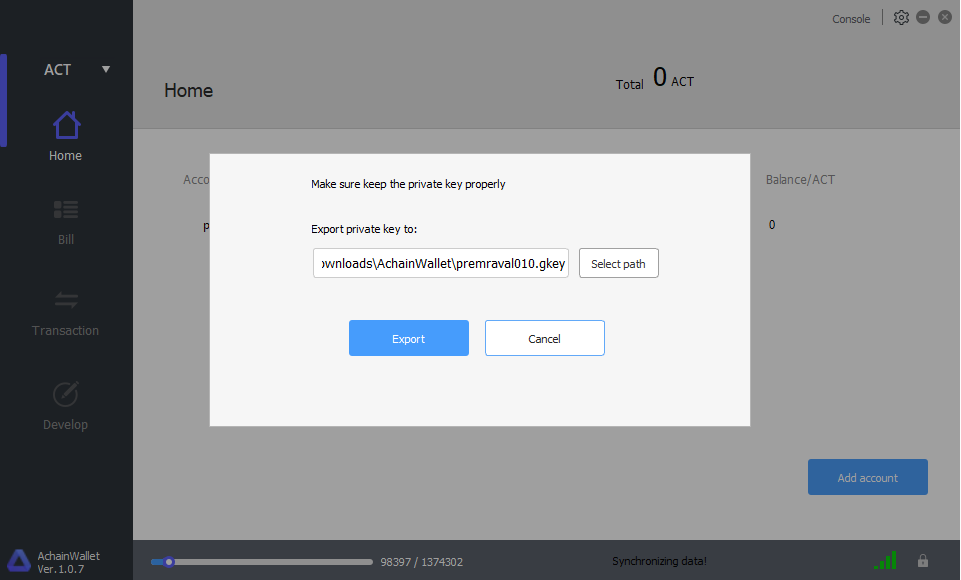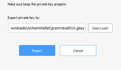 The Achain Wallet was built for digital assets management. The private key with file format. Gkey is only the certificate to own and transfer your digital assets. Please keep it properly. It is recommended to backup your private key to at least two separated safe places, such as hard-disk cartridge, U disk. Don’t tell anyone your private key, otherwise those assets might be stolen.