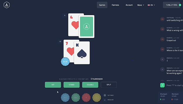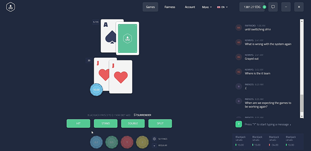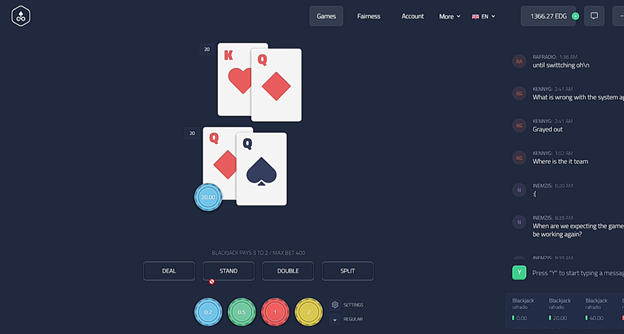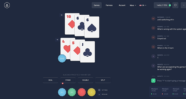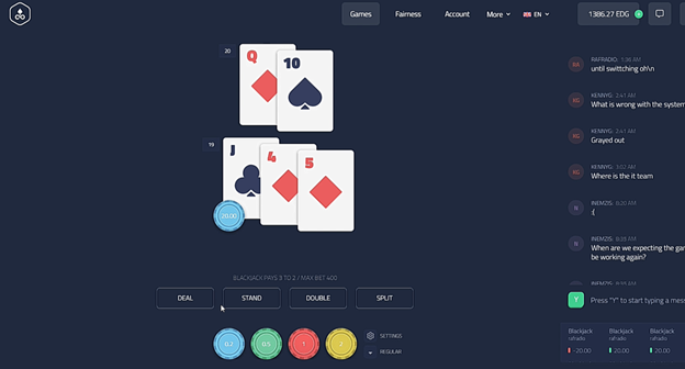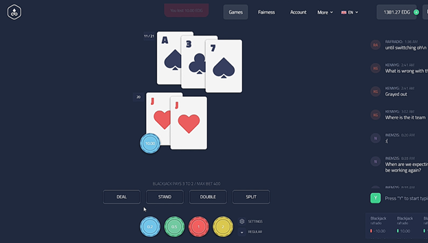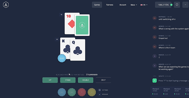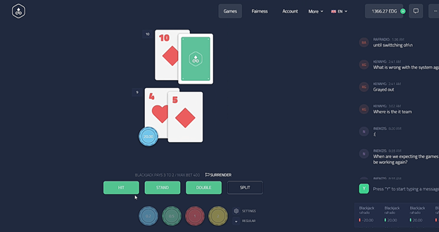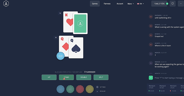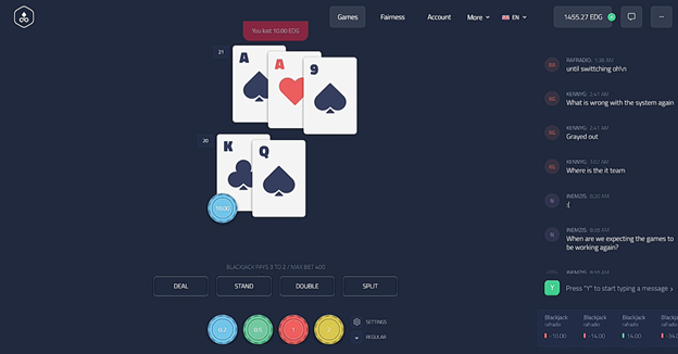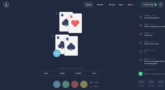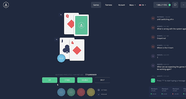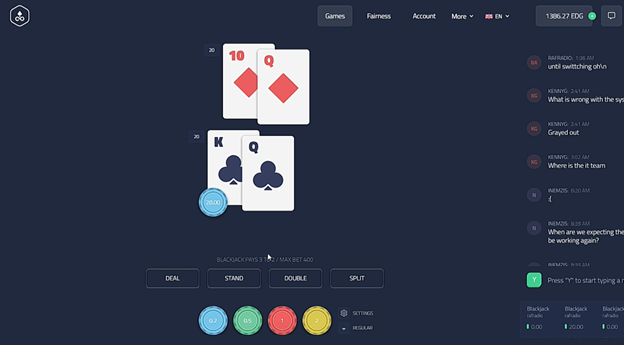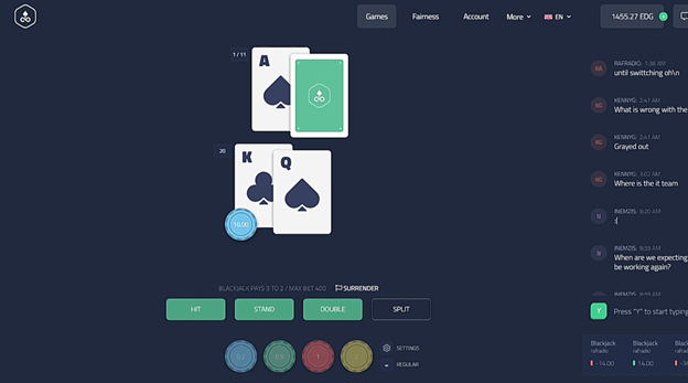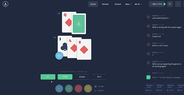 Almost winning hand Player’s 20 against “A”. To have “Ace” much worse than to have “10”. And according to Edgeless Casino rulers Dealer certainly doesn’t have natural Blackjack or “21”.