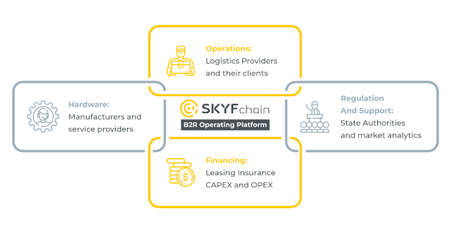 Proses bisnis logistik saat ini dirancang dengan pemikiran manusia, aclier acustomeror dll. Autopilots untuk robot kargo, AI dan bidang pengembangan IOT mengisyaratkan bahwa suatu hari, robot dapat bekerja tanpa dikendalikan oleh orang lain. Ini akan membawa penghematan yang sangat besar sejak saat ini, sekitar 50% biaya logistik sedang dalam proses melahirkan. Lapangan di robotika kargo memerlukan investasi, dan investasi membutuhkan asuransi, manajemen risiko dan pengendalian. Dengan demikian, robot kargo tak berawak menjadi aset yang memerlukan jenis peraturan dan proses bisnis baru. Kami berencana mengembangkannya di Platform Operasi SKYFchain.