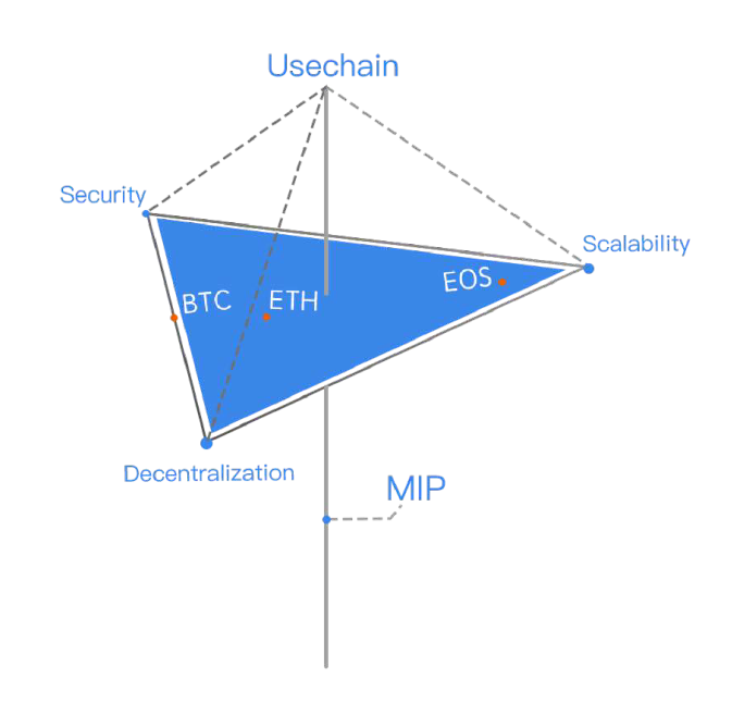Thanks to multi-level innovations in technology and structure, Usechain is able to achieve the ideal balance between scalability, security and decentralization - the "impossible trinity" as they are called. "Impossible," because before that no blockchain had ever managed to achieve a good result in all these three aspects. The blockchains of bitcoin and ether, for example, is considered like the most decentralized and safe, but they have obvious problems with scalability. EOS is now one of the fastest and most scalable, but this blockchain is almost centralized - only ten addresses hold 49.67% of all tokens.