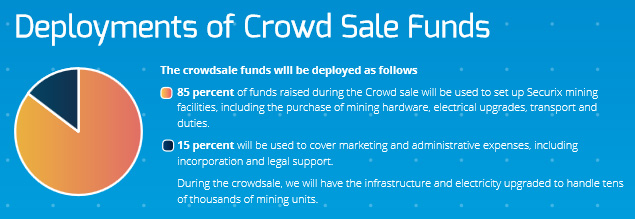 Securix is raising funds using a crowd sale. This is a very common and efficient way to raise new funding for companies. Ethereum is most commonly accepted as a means of payment for these crowd sales. These coins are very easy to store securely and transfer to other parties. Eighty five percent of the funding raised by the Securix crowd sale will go toward setting up the mining facilities which includes the hardware, electrical work, and other expenses. The remaining fifteen percent of the raised funds will be put towards administrative expenses and marketing expenses.