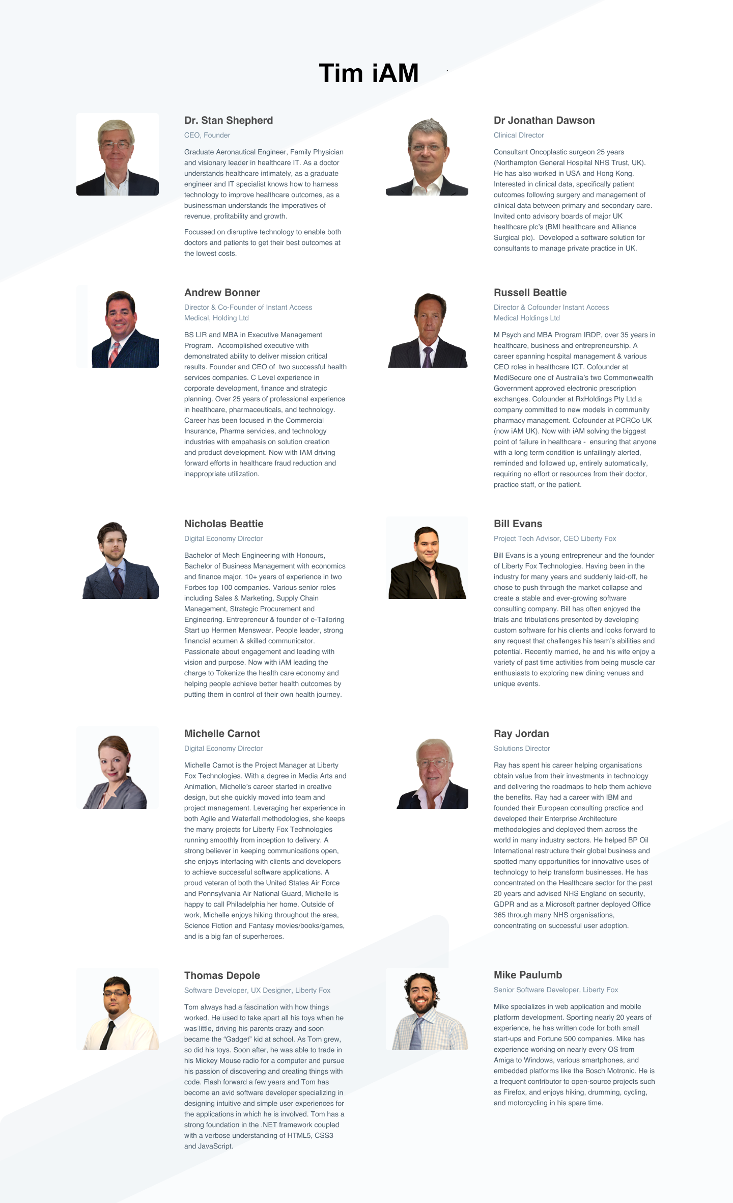 IAM's integrated platform solves the biggest health problems including insurance fraud, medication compliance, prescription abuse and also the portability of medical data. With company partners, Guardtime, Healthcare Gateway and DXS, our solution will be accessible to more than 70% of the UK population. Users can share their notes (guaranteed with blockchain) and pay for services with iAM tokens. Our health economy is governed by smart contracts. Patients, doctors, insurance, researchers, public health institutions and large pharmacies often have different goals. iAM reconciled conflicting goals and provided win-win results for all participants. We call this a consensus point.