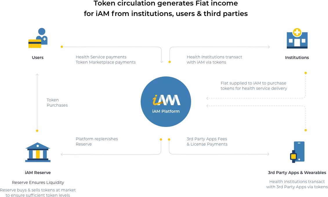 Members settle payments for health services with iAM tokens. These transactions create iAM’s tokenized healthcare economy.