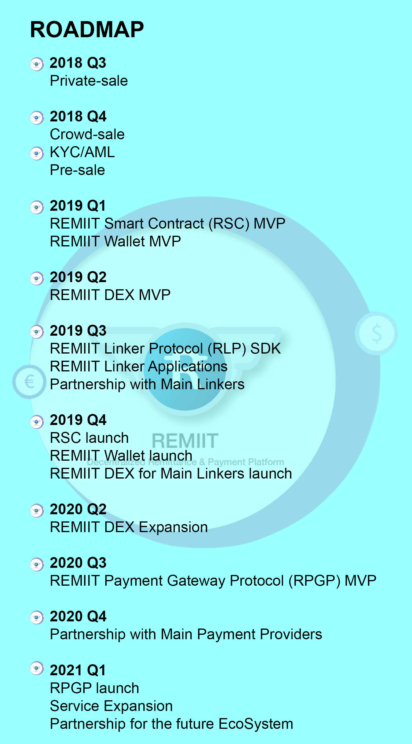 The money transfer and payment sector is not as friendly or open to the current adoption of decentralization and P2P interactions. However this area of services are the most crucial aspects that should be adopted by the blockchain. Through the blockchain and smart contract technologies, REMIIT will ensure to be the benchmark of blockchain adoption where the blockchain can be used for actual business services working with pre-existing Money Transfer and Payment Providers.