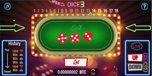 Dice3, a game of how to predict and match the sum of the three dice in advance, allows the user to set the catch value and select up and down. The user can turn the dice three times in total, and when the sum of the three dice is 3 to 10, the result is Down