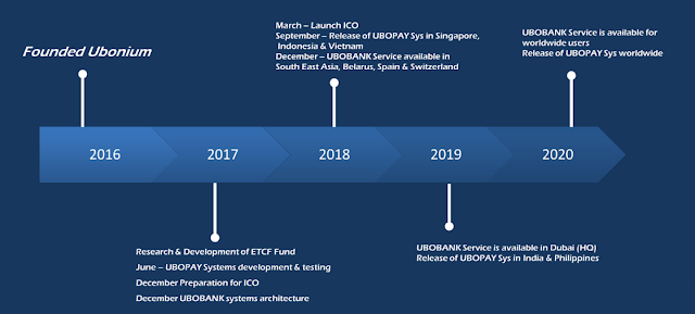 Dalam 2 tahun terakhir mempelajari pasar cryptocurrency, tim Ubonium dibangun dan bereksperimen di berbagai platform di blockchain untuk mendukung jaringan Ubonium. Sebagai hasil dari menciptakan jaringan multi-produk ini untuk mendukung dan bertukar nilai untuk satu sama lain dengan cara yang hemat biaya, Token Ubocoin telah dibuat. Platform ETCF diuji sejak Januari 2018 untuk memastikan bahwa transaksi bersifat otonom dan aman dan hari ini Pasar Platform ETCF adalah kehidupan dan tingkat produksi.