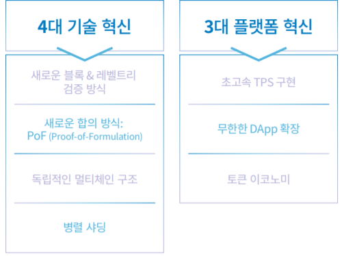 4대 기술혁신 부분에서 새로운 블록검증방식(PoF)을 개발하였고 레벨트리 검증 방식으로 기존의 머클트리를 효율화 시켰다고 합니다. 이 레벨트리는 기존의 블록 검증과정에서 검증이 되는 부분을 머클트리에서 한번 더 검증하는 불필요한 검증 과정을 효율화 시키고 문자열을 숫자열으로 변환하여 총 데이터의 크기도 줄였다고 합니다.